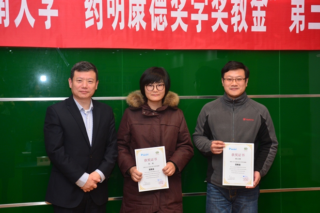 王书记宣布了获奖者名单。在欢快的音乐声中,与会的嘉宾为获奖师生颁发了荣誉证书。获奖学生代表焦蕴发表了获奖感言,表达了对无锡药明康德生物技术有限公司的感谢和对学院培养的谢意。在今后的学习生活中,将会带着一颗感恩的心,努力工作、努力学习,将企业的拼搏精神和和社会责任感传递下去。